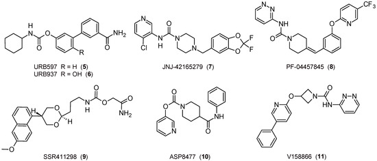 Potential applications for neuropathic and inflammatory pain have been demonstrated with URB597 [83], which had also passed Phase I clinical trials several years ago (data not available), and URB937 (Figure 3) [84,85,86], which showed peripheral FAAH inhibition without the involvement of CNS. On the other hand, PF-04457845 produced potent CBR-dependent antinociceptive effects in both inflammatory and non-inflammatory arthritic pain models [87], but in related phase II clinical trials, it was not effective [88]. Moreover, JNJ-42165279 showed analgesic properties in a neuropathic pain model [74]. The piperidine-carbamate ASP8477 [89] and the azetidine-urea V158866 derivatives (Figure 3) [90] demonstrated significant analgesic effects in animal models of pain, but even in this case, the phase II clinical trials did not give the expected results [65]. For an overview of the influence of ECS in pain regulation, see [91], while for a FAAH inhibitor clinical perspective, see [92].
