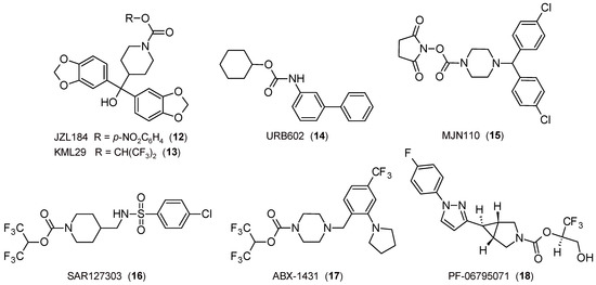 Of particular interest is the discovery of the first FAAH enzyme inhibitors dates back just over twenty years ago, while those of MGL appeared a few years later. Since then, there have been numerous studies that have made it possible to expand the panorama of molecules available to the scientific community. The compounds that have emerged over time have the common need to be excellent substrates for enzymes. Therefore, all contain a reactive group able to favor the nucleophilic reaction. However, they differ from each other not only for the type of inhibition expressed (reversible vs. irreversible) but, above all, for the structural characteristics, which allow the opportunity to have various classes, and for potential therapeutic applications. A distinct description of the classes of FAAH and MGL inhibitors will be made here, in particular on those owing a therapeutic potential related to pathologies that may have a direct or indirect influence on psyche disorders. For anything not covered here, please refer to some excellent previously reported reviews [29,66,67,68,69,70].