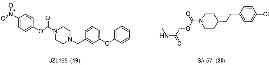 Finally, it is interesting to consider some exemplary compounds reported as inhibitors of both enzymes. Indeed, covalent piperazine-carbamate-based inhibitors JZL195 [110] and SA-57 [111] (Figure 5) reduce inflammation-induced allodynia at a dose that does not cause side effects [112,113].