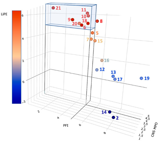Ligand efficiency metric analysis on the selected inhibitors 2, 5–21. Compounds falling within the colored volume are expected to display the highest efficiency, selectivity, and brain permeation. See text and Table S1 for details.