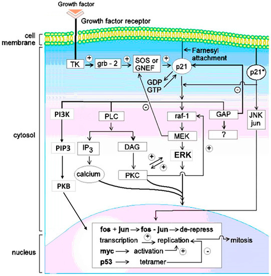 Pincus et al. Wild-type (RAS-p21) and Oncogenic (RAS-p21*) Signal Transduction Pathways. A growth factor such as EGF or insulin binds to its receptor (upper left)—for example, EGFR—extracellularly. The receptor contains three domains: the extracellular growth factor-binding domain, the trans-membrane domain and the intracytosolic domain. The latter contains a tyrosine kinase (TK in the figure) which becomes activated when the receptors dimerize upon binding to the growth factor. This event enables the intracytosolic domain to bind to the adapter grb-2 protein that concurrently binds to and activates a guanine nucleotide exchange factor (GNEF), SOS, a protein that in turn binds to RAS-p21, causing it to exchange GDP for GTP. In the GTP-bound state, RAS-p21 becomes activated. In its activated state, it induces mitogenic signal transduction which occurs only if RAS-p21 is bound to the inner surface of the cell membrane through a covalently attached farnesyl moiety in thioether linkage to Cys 186 catalyzed by the enzyme, farnesyl transferase. If RAS-p21 is not membrane-bound, it acts as a competitive inhibitor of membrane-bound ras. An important target of activated membrane-bound RAS-p21 in mitogenic signaling is the serine-theonine kinase, raf, a 74 kDa Ser/Thr kinase protein that, in turn, directly binds to and activates another serine-threonine kinase, MEK in a so-called kinase cascade. The latter protein activates ERK. This all-important protein shuttles between the cytosol, where it is involved in cytoskeletal rearrangements (the name MAPK stands for mitogen activated or microtubule-activating protein kinase) and the nucleus in which it activates the critically important nuclear transcription factor, fos, that itself forms a heterodimeric complex, called AP1, with the critically important nuclear transcription factor, jun, that is activated by another kinase, jun-N-terminal kinase (JNK), that is normally activated on a separate pathway called the stress-activated protein (SAP) pathway. The AP1 complex induces the transcription of many pro-mitogenic proteins including cyclins and nuclear skeletal proteins called nuclear matrix proteins ( or NMP’s); other nuclear proteins, such as myc, also transcriptionally active, are also often activated in this process. Anti-oncogene proteins, such as p53, also become activated. This protein blocks the transcription of pro-mitotic proteins (minus sign on p53 arrow) and induces apoptosis in transformed cells. On the right of the figure, oncogenic RAS-p21 (RAS-p21*) is shown interacting with and activating JNK, which seems to be a unique aspect to oncogenic RAS-p21. Work in oocytes (see text) suggests that wild-type RAS-p21 may also activate the dual specificity kinase TOPK (not shown in the figure), which is known to bind to RAF and is in the MEK superfamily. Apparently, oncogenic RAS-p21 does not utilize this pathway. The activated state of RAS-p21 is regulated by the protein, GAP (GTPase-Activating Protein), that enhances the native GTPase activity of RAS-p21. GAP induces the hydrolysis of GTP to GDP, resulting in the inactivation of RAS-p21. However, GAP itself may be involved in mitogenic signal transduction, hence, the question mark in the arrow below the GAP box in the figure. As shown on the left side of the figure, RAS-p21 also interacts directly with phosphoinositol-3-hydroxy kinase (PI3K), which catalyzes the synthesis of phosphatidylinositol 3-hydroxyphosphate or triphosphate (PIP3) that is involved in the activation of protein kinase B (PKB), also known as AkT, of which among many functions, induces cell proliferation. Activated RAS-p21 further induces the activation of phospholipase C (PLC) that catalyzes the formation of diacylglycerol (DAG), an activator of protein kinase C (PKC) that is especially critical to the oncogenic RAS-p21 pathway and the synthesis of inositol triphosphate (IP3) of which mobilizes the release of calcium.