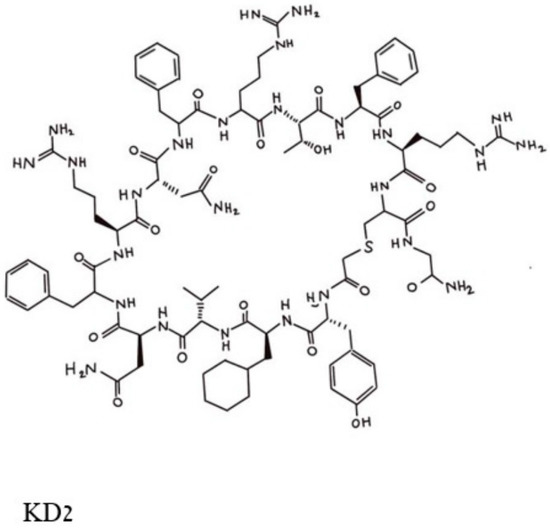 KD2 and other cyclic peptides that specifically bind to the GTP-bound state of oncogenic G12D-RAS-p21 have thus far not been found to inhibit cancer cell growth; this is most likely due to the fact that they do not readily penetrate the cell membranes of these cells [29]. At present, efforts to modify these cyclic peptides with agents that can induce cell membrane penetration are being conducted [29]. It should be noted that cell-penetrating forms of KD2 and related cyclic peptides would be expected to be effective in treating cancer cells that contain only the G12D mutant form of RAS-p21 and may not be effective against RAS-p21 forms that contain other amino acid substitutions at position 12 or at other positions such as at Gly 13 and Gln 61.