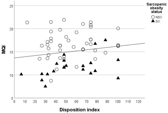 We investigated potential correlations between body composition, muscle function and insulin resistance parameters. The relationship between left MQI and disposition index, grouped by sarcopenic obesity status, is depicted in Figure 1; according to the partial correlation analysis, after controlling for body fat percentage and menopause, a positive correlation was apparent between the disposition index and left MQI (partial r = 0.409, p = 0.01), but not right MQI (partial r = 0.245, p = 0.133).