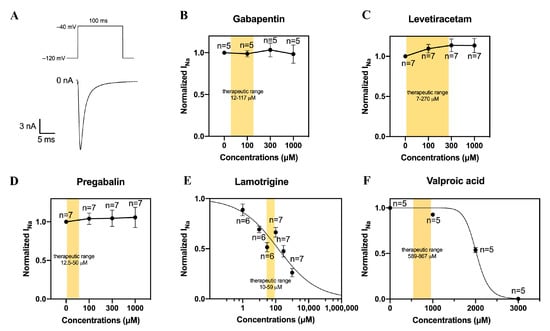 Effects of anti-epileptic drugs on current densities of Nav1.5 channels expressed in HEK293 cells. (A) Typical Nav1.5 current elicited by application of 100 ms depolarizing pulses from −120 to −40 mV. (B–D) Normalized Nav1.5 current in the absence or presence of 100, 300, or 1000 µM gabapentin (B), levetiracetam (C), and pregabalin (D). (E,F) Lamotrigine and valproic acid induced concentration-dependent inhibition of the Nav1.5 current magnitude. Solid lines are Hill fits to the average data. Values are normalized to the values measured under baseline conditions. The yellow parts indicate the therapeutic concentrations of the AEDs. Numbers near symbols indicated the number of cells (n) measured at the given concentrations.