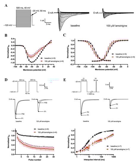 Effects of 100 µM lamotrigine on density and gating kinetics of Nav1.5 channels expressed in HEK293 cells. (A) Typical Nav1.5 currents under baseline conditions and in the presence of 100 μM lamotrigine. Inset: voltage clamp protocol used to measure current-voltage (I-V) relationships (B) and the voltage dependency of (in)activation (C). Cycle length was 5 s. (B) The Nav1.5 current-voltage (I-V) relationships before and after the application of 100 μM lamotrigine. The Nav1.5 current was normalized to the maximal peak amplitude under baseline conditions, but the peak current was set to −1 to retain the well-known inward direction of sodium current. (C) Effects of lamotrigine on the voltage dependency of the Nav1.5 current (in)activation. Solid lines are Boltzmann fits to the average data. (D) Use dependency under baseline conditions and in the presence of lamotrigine measured during a train of 30 depolarizing pulses with an interpulse interval of 50 ms. Inset: voltage clamp protocol used to measure (upper panel) and typical Nav1.5 currents under baseline conditions and in the presence of 100 μM lamotrigine (middle panel). (E) Recovery from inactivation of the Nav1.5 current in the absence and presence of 100 µM lamotrigine measured with a double-pulse protocol with variable interpulse intervals. Inset: voltage clamp protocol used to measure (upper panel) and typical Nav1.5 currents under baseline conditions and in the presence of 100 μM lamotrigine with an interpulse interval of 50 ms (middle panel). * p < 0.05 lamotrigine versus baseline (Two-Way RM ANOVA).