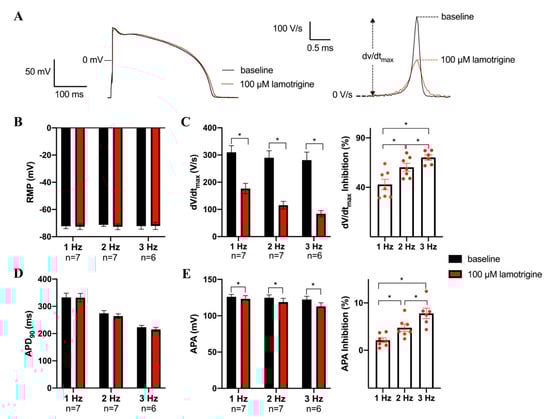 Effects of 100 µM lamotrigine on action potentials (APs) of rabbit ventricular cardiomyocytes. (A) Superimposed representative APs at 1 Hz under baseline conditions and in the presence of 100 µM lamotrigine. Inset: time derivatives of the AP upstrokes. The dV/dtmax are aligned by the peak. (B–E) Average AP characteristics at 1, 2, and 3 Hz of resting membrane potential (RMP, (B)), maximal AP upstroke velocity (dV/dtmax, (C, left panel)) and the inhibition percentage of dV/dtmax induced by lamotrigine (C, right panel), AP duration at 90% of repolarization (APD90, (D)), AP amplitude (APA, (E, left panel)), and the inhibition percentage of APA induced by lamotrigine (E, right panel). Data are mean ± SEM. Numbers below frequencies indicate the number of cells (n) measured at a given frequency. * p < 0.05 lamotrigine versus baseline (Two-Way RM ANOVA or One-Way RM ANOVA).