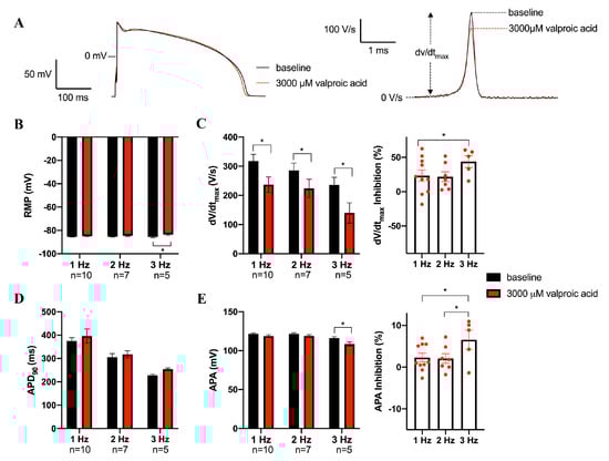 Figure 5A shows typical APs under baseline conditions and in the presence of 3000 µM valproic acid at 1 Hz. The average AP parameters at 1 to 3 Hz are summarized in Figure 5B–E. Valproic acid also decreased dV/dtmax in a frequency-dependent manner, e.g., by 23.7 ± 10.6% (from 344.0 ± 20.6 to 261.9 ± 32.3 V/s, n = 10, p < 0.05) at 1 Hz, and by 37.4 ± 7.8% (253.6 ± 25.1 to 156.7 ± 38.0 V/s), n = 5, p < 0.05) at 3 Hz (Figure 5C). APA was also reduced, but only statistically significantly at 3 Hz (Figure 5E). There were no statistically significant effects on RMP or APD90, with the exception of a reduction in RMP at 3 Hz (Figure 5B,D).