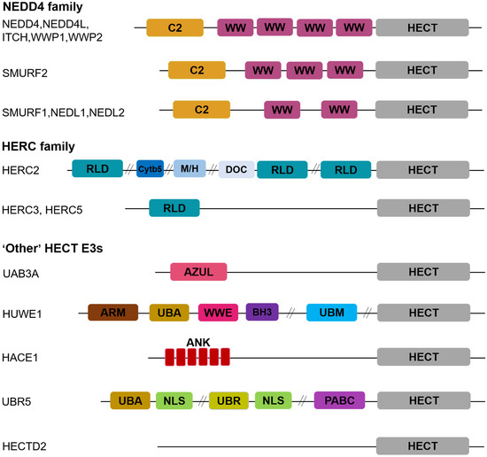Structural features of the HECT E3 ligases. HECT E3 ligases are classified into three subfamilies: NEDD4, HERC, and ‘other’ HECT E3 family. The NEDD4 family is characterized by C2 and WW domains, the HERC family contains one or more RLD domains, and the ‘other’ HECT E3 family carries distinct structural domains at the N-terminus. The domain abbreviations used are as follows: C2, Calcium-dependent lipid binding domain; WW, WW domain; HECT, homologous to E6AP C-terminus; RLD, regulator of Chromosome Condensation 1 repeat-like domain; Cytb5, cytochrome b5-like heme/steroid-binding domain; M/H, MIB-HERC2 domain; DOC, APC10/DOC domain; AZUL, amino-terminal Zn-binding domain of UBE3A ligase; ARM, armadillo repeat-containing domain; UBA, ubiquitin-associated domain; WWE, WWE domain; BH3, Bcl-2 homology 3 domain; UBM, ubiquitin-binding motif; ANK, Ankyrin repeat-containing domain; NLS, nuclear localization sequence; UBR, ubiquitin-recognin box; PABC//MLLE, polyadenylate-binding protein C-terminal domain.