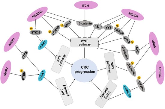 WWP1 is a multifunctional protein and has been involved in numerous human tumors [90]. Upregulated WWP1 has been reported in CRC and is associated with tumor size, T classification, distant metastasis, TNM stage, and adverse patient prognosis [44]. WWP1 depletion attenuates the proliferative and invasive phenotype of CRC cells, likely by inactivating the PTEN/AKT signaling pathway [44]. In addition, the negative correlation between WWP1 and miR-16 was found in CRC, and miR-16 could target WWP1 to suppress CRC tumor growth [45]. WWP1 seems to exert pro-oncogenic functions in CRC (Table 1), and future studies are deserved to verify the role of WWP1 in CRC.