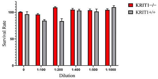 Viability assay performed in KRIT1-knockout (KRIT1−/−) and KRIT1-overexpressing (KRIT1+/+) mouse embryonic fibroblasts (MEFs) left untreated (NT) or treated for 24 h with injectable nanoemulsions (ILs) at different concentrations. After treatment, cell viability was measured as described in Section 2.6 of Materials and Methods, and the best dilution was used to develop the following analyses.