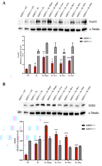 We next assessed the efficacy of drug-loaded lipid NEs in rescuing the major KRIT1-loss-induced molecular dysfunctions. To this end, we treated either KRIT1−/− and KRIT1+/+ MEF cells using ILs loaded with Rapa, Avn, and Bvz, or Mix, and analyzed the expression levels of biomarkers associated with KRIT1 loss of function. The results of the treatments with free drugs and Mix are shown in Figures S2–S4 (Supplementary Materials).