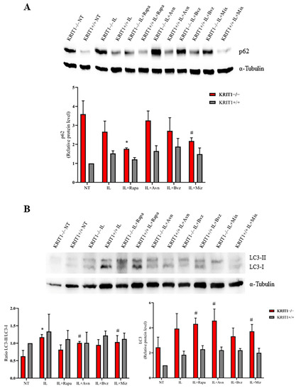 Positive effects on KRIT1-loss-dependent defective autophagy were found after cell treatment with different compounds through the analysis of the expression level of the p62 biomarker, which accumulates and is increased when autophagy is inhibited. As shown in Figure 3A, the treatment with Rapa-loaded lipid nanocarriers (Rapa-ILs) decreases p62 protein levels in KRIT1−/− cells to a large extent, and, in a similar manner to the free drug (Figure S3A) [26], it is able to restore the biomarker level of control cells (KRIT1+/+) (Figure 3A). Moreover, the treatment with Rapa-ILs can further increase the level of LC3 II/I (Figure 3B) compared to not-treated (NT) cells, in which the ratio is significantly reduced in KRIT1−/− cells compared to healthy controls (KRIT+/+) due to autophagy inhibition. Indeed, the reactivation of autophagy enhances the production of the microtubule-associated protein 1A/1B-light chain 3 (LC3), an important component of autophagosome membranes, which is usually reduced during autophagy inhibition. Notably, Rapa is able to increase not only the total LC3 level but also the LC3 II/I ratio by the cleavage and conjugation to phosphatidylethanolamine of the inactive LC3-I isoform into the active LC3-II, which plays a key role in the formation of autolysosomes [26]. However, while Rapa can also increase the cellular antioxidant responses through autophagy reactivation (Figure 2), thus allowing the removal of ROS-generating dysfunctional mitochondria, Avn is devoid of a specific pro-autophagic activity.