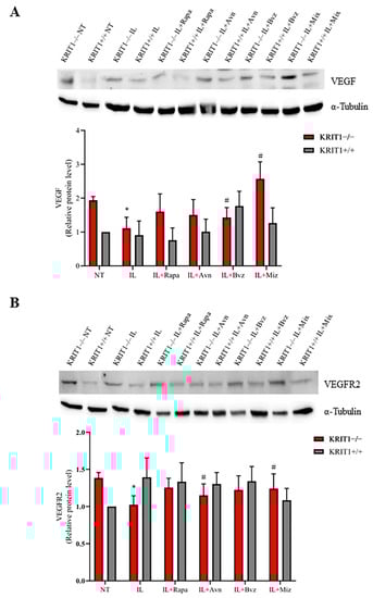 (A) Immunoblot analysis and representative histogram of vascular endothelial growth factor (VEGF) in KRIT1-knockout (KRIT1−/−) and KRIT1-overexpressing (KRIT1+/+) mouse embryonic fibroblasts (MEFs) untreated (Ctrl) or treated for 12 h with injectable nanoemulsions (ILs) loaded with rapamycin (Rapa), bevacizumab (Bvz), yeast avenanthramide I (Avn), or with a mixture of all three compounds (herein referred to as Mix) to a final concentration of: Avn = 15 μg/mL (50 μM), Rapa = 0.46 μg/mL (500 nM), Bvz = 10 μg/mL (70 nM). After treatment, cells were lysed, as described in Materials and Methods, and analyzed for the indicated proteins by Western blot (WB) analysis. (B) Immunoblot analysis and histogram representing the quantitative evaluation by densitometric analysis of VEGFR2 protein expression levels. Quantifications are relative protein level units referring to the average value obtained for KRIT1+/+ samples. α-tubulin was used as internal loading control for WB normalization. Statistical analysis: treatments vs. NT in KRIT−/− MEFs: # p < 0.1; * p < 0.05.