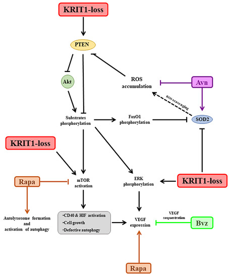 KRIT1 loss causes a significant downregulation of FoxO1 expression and transcriptional activity in CCM disease models [17,60], which has been correlated with the modulation of major cellular stress response regulators, such as protein kinase B (PKB/Akt) and 5′-adenosine monophosphate-activated protein kinase (AMPK) [61,62]. In particular, the significant downregulation of FoxO1 protein levels, detected in the KRIT1−/− cells compared to healthy controls, is followed by a drastic reduction in its downstream target SOD2, a major antioxidant enzyme, which is known to cause a compromised cellular response to oxidative stress [17]. This alteration, together with the upregulation of the nuclear factor erythroid 2-related factor 2 (Nrf2) pathway and glyoxalase system (GLO1 and GLO2), leads to chronic adaptive homeostasis that sensitizes cells to additional stress events [20]. Furthermore, these changes are known to play a role in the oxidative post-translational modifications (PTMs), including the S-glutathionylation of chaperonins, metabolic enzymes, and structural proteins [54,63], underlying the fine-tuned regulation of KRIT1 activity in response to inflammatory and oxidative stress conditions [20,54,63,64]. Interestingly, the signaling pathways involving Akt and AMPK are highly interconnected, sensitive to the cellular metabolic and redox state, and involved in the regulation of autophagy [65] and angiogenesis [66]. This suggests a potential relationship with the pleiotropic effects of altered redox homeostasis and signaling, so far associated with KRIT1 loss of function [13,15,16]. In particular, there is evidence that oxidative inactivation of the phosphatase and tensin homolog (PTEN) protein, a major negative regulator of PI3K-dependent Akt through the dephosphorylation signaling pathway, causes a hyperactivation of Akt and consequent modulation of its downstream targets, including the activation of mammalian target of rapamycin (mTOR) and the inhibition of FoxO1, leading to defective autophagy and enhanced cell sensitivity to oxidative stress [67,68]. Indeed, sporadic CCM lesions are often characterized by causative mutations in genes other than CCM ones [15,69,70] and including PTEN, whose deficiency results in a severe phenotype [62,71]. Furthermore, the CCM phenotype is typically associated with increased VEGF, which is due to the overexpression of both β-catenin [72,73,74] and extracellular-signal-regulated kinase (ERK) [75]. In fact, the Akt phosphorylation pathway, which is significantly enhanced in KRIT1−/− in vitro models [62,75], also leads to the activation of ERK [62,75] and mTOR pathways [26]. In turn, mTOR activates the cluster of differentiation 40 (CD40) [76] and hypoxia-induced factor (HIF) [77] pathways, leading to the upregulation of VEGF (Figure 5). In this light, a treatment based upon antioxidant compounds might allow the restoration of proper cellular antioxidant responses able to reduce the intracellular accumulation of ROS as well as to reactivate the autophagic processes and reduce the sensitization to additional stress events in a cellular model [20,64]. Thus, in our approach, while the treatment with antioxidant Avn should counteract the oxidative stress [31,32], Rapa should reactivate the defective autophagy [26,28,78] and Bvz reduce the activation and function of VEGF and VEGFR2, which might result in the inhibition of angiogenesis [75] (Figure 5).