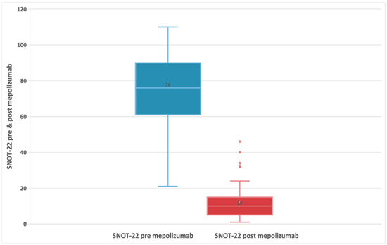 Evolution of SNOT-22 score in patients with refractory chronic rhinosinusitis and nasal polyps, pre-treatment, and 24-week post-treatment with 100 mg of mepolizumab every 4 weeks.