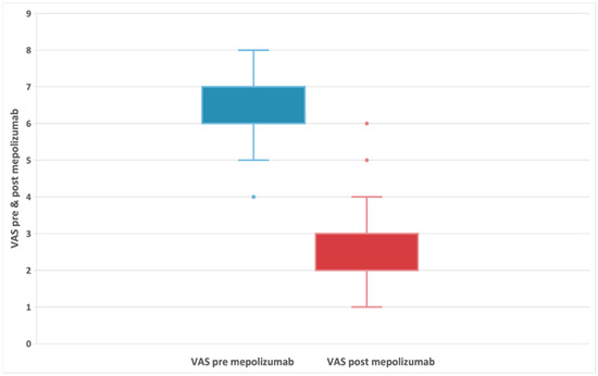 Evolution of VAS symptoms in patients with refractory chronic rhinosinusitis and nasal polyps, before and after 24-week treatment with 100 mg of mepolizumab every 4 weeks.