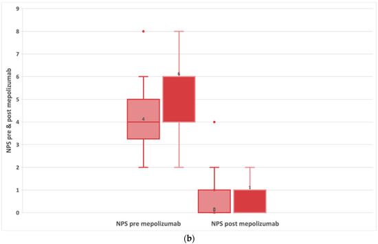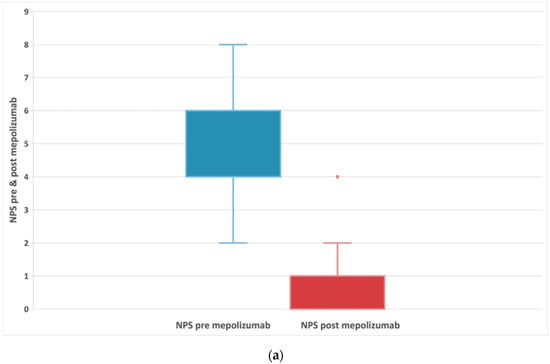 (a) Evolution of NPS in patients with refractory chronic rhinosinusitis and nasal polyps, pre-treatment and after 24-week treatment with 100 mg of mepolizumab every 4 weeks. (b) Evolution of NPS in patients with refractory chronic rhinosinusitis and nasal polyps, comparing subjects with and without AERD pre-treatment and after 24-week treatment with 100 mg of mepolizumab every 4 weeks.