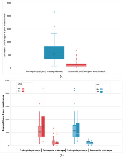 A Wilcoxon signed-rank test showed that the 24-week mepolizumab treatment elicited a statistically significant change (median difference: −460; 95% CI: −610; −353) in patient eosinophils cells with a median baseline of 500 cell/mcl (IQR 340;830). In fact, the median number of eosinophils was 97 cell/mcl (IQR 60;160) post-treatment p < 0.001 as shown in Figure 4a. We found a greater reduction in the level of eosinophils among patients with AERD compared to non-AERD, while there are no differences based on the existence of previous surgeries (Figure 4b).