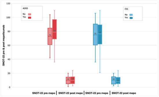 Evolution of SNOT-22 scores pre-treatment and after 24-week treatment with 100 mg of mepolizumab every 4 weeks among patients with AERD compared to non-AERD and subjects with previous surgery compared to non-previous surgery.