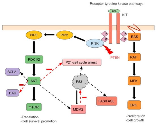 A simple schema of molecular aberrations in PMGTs. The most common mutations described in PMGCTs are TP53 (46%), c-KIT (18%), KRAS (18%), PTEN (11%), NRAS (4%), and PIK3CA (4%). K-RAS and N-RAS mutations cause Ras-Raf-MEK-ERK pathway activation regardless of receptor activity. The PTEN tumor suppressor gene controls cell growth and migration. Its mutation activates the PI3K pathway, leading to impaired mitotic arrest and cell survival promotion. MDM2 and P53 regulate each other through feedback mechanisms. P53 mutation and/or MDM2-induced ubiquitination and disruption of P53 inhibit apoptosis. Finally, the c-KIT gain-of-function mutation and/or KIT overexpression activates downstream signaling by increasing receptor tyrosine kinase activity. Furthermore, these pathways can interact and co-regulate downstream processes, promoting cell survival and proliferation.