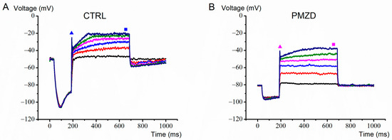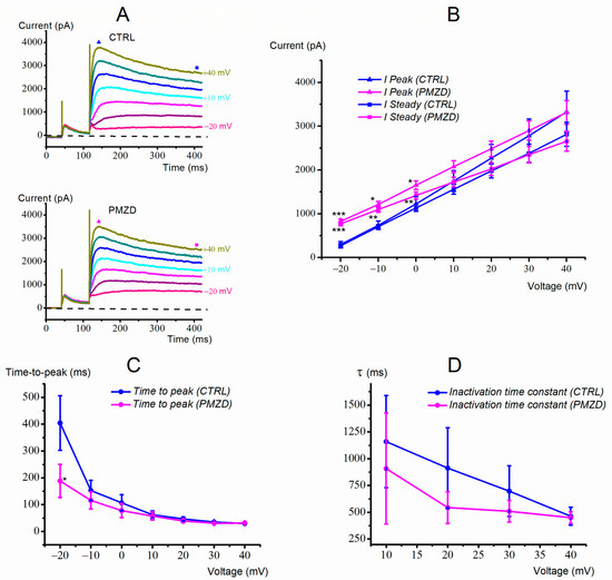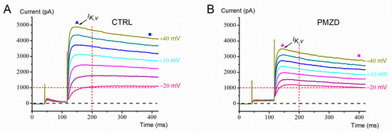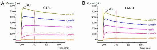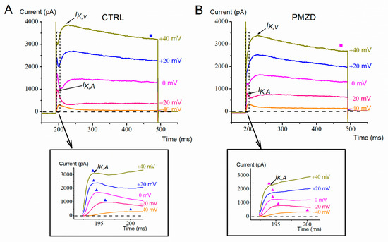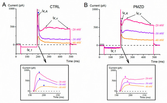 Consistent with previous reports [10,22], in the last prenatal week (E15–E21), the conditioning step at −120 mV elicited IK,1 and/or Ih,, while the subsequent depolarizing steps elicited a large outward K+ current consisting of a fast transient component (IK,A) followed by a slow sustained component (IK,v) (Figure 1A). Following perfusion of the extracellular solution added with pimozide, the activation and inactivation kinetics of IK,v appeared to be accelerated, producing at −30 and −20 mV a clear second peak after that, which was due to IK,A (Figure 1B). Moreover, the first peak increased at −40 mV and decreased at −30 and −20 mV (see also the expanded traces at the bottom of Figure 1A,B), while there was an increase in the sustained current at all the three voltages.