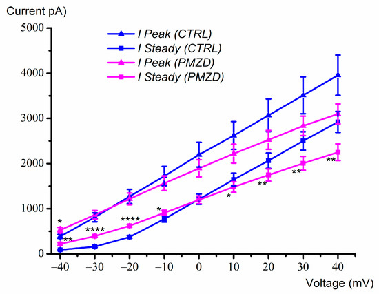 The voltage-dependent effect of pimozide on the peak and the sustained outward K+ current was further investigated in another set of cells by increasing the number of the depolarizing voltage steps up to +40 mV (Figure 2). By increasing depolarization, pimozide reduced the amplitude not only of the first peak of the outward K+ current, which is mainly due to IK,A, but also of the second peak and of the sustained K+ current, which are due to IK,v. The inhibitory effect of pimozide on IK,v at positive voltages can be explained by the substantially accelerated inactivation of IK,v, negatively impacting the K+ current amplitude. The average peak and steady-state current/voltage (I/V) relations are shown in Figure 3. Note that the peak amplitude was measured in the first 17 ms of the voltage steps, as indicated by the dashed rectangle in Figure 2, and it mainly consists of IK,A (see also the expanded traces at the bottom). The steady-state current was measured towards the end of the depolarizing step (filled squares) and consists of IK,v since IK,A is expected to inactivate almost completely during the 300 ms depolarizing steps [10]. The dual (increase/decrease) voltage-dependent effect of pimozide on IK,v at most negative/positive voltages was statistically significant. For example, following pimozide perfusion, the steady-state current amplitude increased from 162.16 ± 20.05 pA to 393.90 ± 23.68 pA at −30 mV (n = 7; t = 9.381, df = 6, p < 0.0001 Student’s paired t test), while at +40 mV it decreased from 2920.74 ± 232.42 pA to 2251.01 ± 184.60 pA (n = 7; t = 5.116, df = 6, p = 0.0022 Student’s paired t test; see Table S3 in the Supplementary Material).