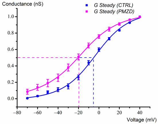 The increase in IK,v is a novel effect of pimozide, and it was further characterized by investigating the activation curve of IK,v. Exploiting the fact the IK,A inactivates completely during the 300 ms depolarizing steps [10], we calculated the chord conductance at the steady-state (see Section 2) in control conditions and in the presence of pimozide. Although the amplitude of IK,v at the steady state is clearly impacted by its inactivation, this was less pronounced at the negative voltages of interest. The data for each cell were normalized and fitted with the Boltzmann function (see Equation (2) in Section 2). The mean fits, together with the mean data superimposed (±S.E.), are shown in Figure 4. In control condition, at −70 mV IK,v resulted to be on average only 1% active, vs. 9% in pimozide. The half-activation voltage (V1/2) was −4 ± 0.01 mV in control vs. −18 ± 0.01 mV in pimozide. Thus, pimozide shifts the activation curve of IK,v 14 mV in the hyperpolarized direction.