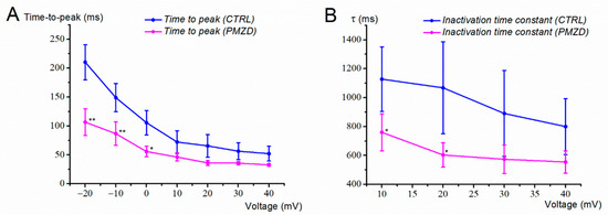 The average values for the time-to-peak of IK,v in control condition and in the presence of pimozide are shown in Figure 6A. Consistent with the traces shown above, the activation time course of IK,v in the presence of pimozide accelerated at all voltages. Of notice, the time-to-peak at a given voltage in control condition, e.g., at 0 mV, was similar to that at −20 mV in pimozide, suggesting a similar shift of IK,v voltage- and time-dependent properties in the presence of the drug.