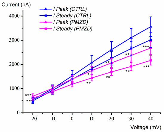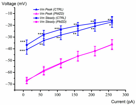 Average peak and steady-state voltage–current (V–I) relations. Values were obtained by measuring the peak and steady-state voltage response elicited by the current steps (n = 7; E15–E20), as shown by filled triangles and squares in Figure 9. Values are shown as mean ± S.E.; see Tables S10 and S11 in the Supplementary Material. * p ≤ 0.05; ** p ≤ 0.01; *** p ≤ 0.001.