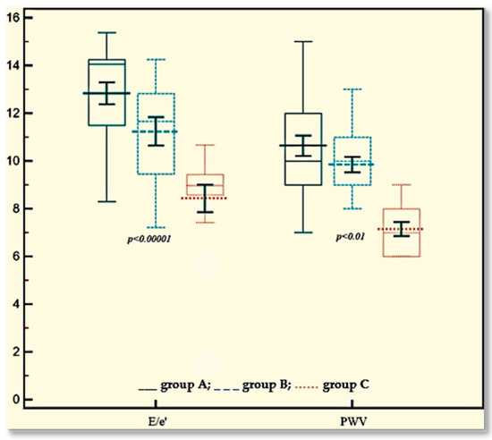 Distribution of E/e’ ratio, PWV values, AoSI, AoD and AoS in study groups. Legend: E/e´ ratio—ratio between the early diastolic velocity ascertained via pulse Doppler (E) and via tissue Doppler imaging (e’) at the level of the mitral annulus; PWV—pulse wave velocity; AoS—aortic strain; AoSI—aortic stiffness index β; AoD—aortic distensibility.