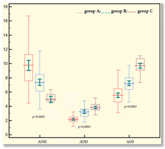 Data analysis was performed by employing the MedCalc Version 19.4 (MedCalc Software Corp., Brunswick, ME, USA) and Microsoft Office Excel 2019 (Microsoft for Windows). Descriptive statistical methods were used for the patients’ clinical data. We utilized the Kolmogorov–Smirnov test to classify the distribution of numerical variables and, as a result, continuous variables with normal distribution were presented as mean and standard deviations (SD). Those with non-normal distribution were presented as median and associated interquartile range (IQRs), whereas categorical variables were expressed as counts (percentages). To compare the three groups (A, B, C), we used the Kruskal–Wallis H test, followed by a post-hoc analysis with the Mann–Whitney U test with a Bonferroni correction applied. To compare continuous variables with normal distribution, we utilized the Student’s t-test, and for variables with non-normal distribution, the Mann–Whitney U-test was applied. To highlight the potential relationship between parameters characterizing AS, AoS, AoSI, AoD, and DD and multiple other demographic, anthropometric, echocardiographic, and laboratory findings, we employed the Spearman’s rank–order correlation and the Pearson’s χ2-test for categorical variables group analysis. Several uni- and multivariate regression analyses were applied to evaluate independent predicting factors associated with the risk of developing AS, impaired aortic elasticity, and DD. The Akaike information criteria were employed to obtain the best regression model. We considered a p-value of less than 0.05 to be indicative of statistical significance.
