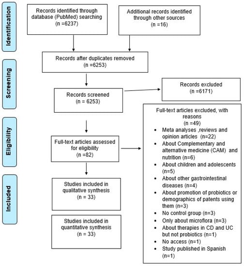 This systematic review was performed according to the Preferred Reporting Items for Systematic reviews (PRISMA) guidelines (Figure 1) [33]. Two researchers (G.V. and C.S.) independently searched the PubMed database from inception to 31 December 2021 for observational and randomized studies examining the possible role of probiotics in inducing and maintaining remission in Crohn’s disease and ulcerative colitis. The keywords were used in various combinations: “Lactobacillus, Bifidobacterium, Saccharomyces, dietary supplement therapies, probiotics, prebiotics, essential oils, honey, natural products, inflammatory bowel disease, Crohn’s disease and ulcerative colitis”. The respective MESH terms are enlisted in Supplementary Table S1.
