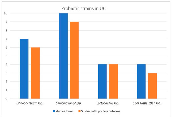 First, we grouped studies via the type of microorganisms used in the intervention formula. Seven studies provided probiotics containing Bifidobacterium species, four Escherichia coli Nissle 1917 strain, four Lactobacillus species, and ten a combination of species including various strains of Bifidobacterium and Lactobacillus species as well as Streptococcus and Clostridium species. Details about the specific probiotic formula used in every study are provided in the Supplementary Material. Probiotics containing Lactobacillus species were effective in all four studies, while Bifidobacterium species have shown positive results in six out of seven studies. The least effective therapeutic option appeared to be Escherichia coli Nissle 1917, provided in four studies, being effective only in half of the cases. Finally, probiotics containing a combination of species presented positive results in nine out of ten studies, indicating the possible effect of symbiosis in maintaining remission. A graphic image of the results is depicted in Figure 2.