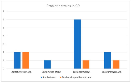 The use of probiotics in Crohn’s disease has been documented in the literature as an effective method in the clinical remission of this specific disease. Pavel et al. (2021), in a systematic analysis of various probiotic microorganisms used in clinical studies in humans and mice and studies concerning the postoperative stage of the disease, concluded that, despite the differences between the probiotic microorganisms used and their dosage, in essence, it was observed that the further use of more than one probiotic improved the progression of the disease. The most effective probiotic microorganisms were Bifidobacterium sp. and S. boulardii [38,39,39,40,70].