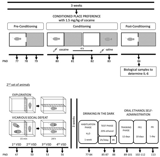 - Rodriguez-Arias, M.; Navarrete, F.; Blanco-Gandia, M.C.; Arenas, M.C.; Bartoll-Andrés, A.; Aguilar, M.A.; Rubio, G.; Miñarro, J.; Manzanares, J. Social defeat in adolescent mice increases vulnerability to alcohol consumption. Addict. Biol. 2016, 21, 87–97. [Google Scholar] [CrossRef]