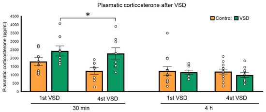 For the analysis of the biochemical data, a two-way ANOVA with the same two between-subjects variables (control and VSD) and a within-subjects variable, sessions, with 2 levels (30 min and 4 h), was performed to analyze the data of corticosterone levels.