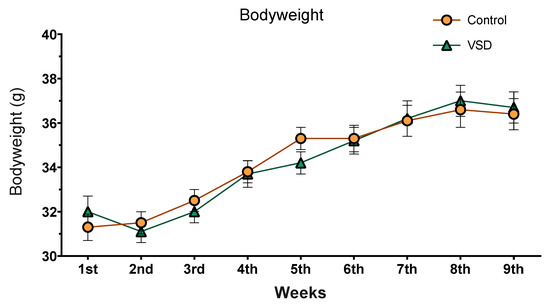Body weight of mice over 9 weeks. Data are presented as mean (±SEM) amount of body weight (control group, n = 20; and VSD group, n = 20).