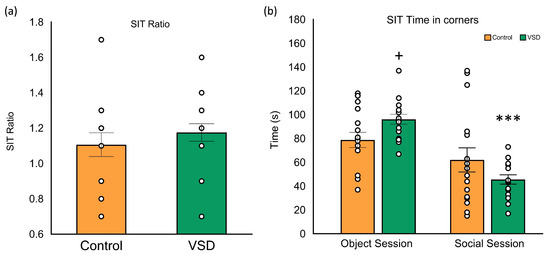 Vicarious Social Defeat VSD did not alter the Social Interaction Test (SIT) ratio in female mice. The bars represent the ratio of the SIT (a) and the mean of the time spent in corners during the object and social sessions (b), and the vertical lines, ±SEM. Values > 1 indicate preference for social interaction, and <1 indicates social avoidance. Female mice were divided into control (n = 16) and VSD (n = 16). Interaction stress x sessions: (F (1,30) = 7.123; p < 0.012), Bonferroni post hoc test + p < 0.05, significant difference compared to the control group; *** p < 0.001, significant difference compared to the object session.