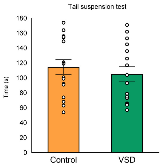 Vicarious Social Defeat (VSD) did not increase time in immobility in the tail suspension test (TST). Bars depict the mean ± SEM of the time (seconds) during which the mice remained immobile in the TST (control group, n = 16; VSD group, n = 16).