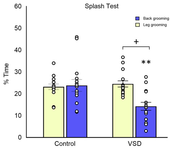 In the ST, the ANOVA for total grooming showed a significant effect of the variable stress (F (1,30) = 5.805; p < 0.023), showing a lower percentage of self-grooming time in VSD females than in control mice (p < 0.05) (see Figure 6). The ANOVA for back grooming also showed a significant effect of the stress variable (F (1,28) = 8.269; p < 0.008), with VSD females displaying less back grooming than controls (p < 0.01). However, the ANOVA for leg grooming did not reveal any significant effect.