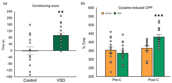 The ANOVA of the conditioning score [F (1,26) = 12.004, p < 0.002] showed higher scores in VSD groups with respect to controls (p < 0.01) (see Figure 7). The ANOVA of the time spent in the drug-paired compartment also showed a significant effect of the interaction Day x Stress [F (1,26) = 10.395, p < 0.003]. Only VSD females increased the time in the cocaine-paired compartment during the Post-C test (p < 0.001).