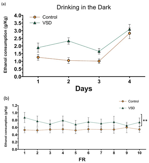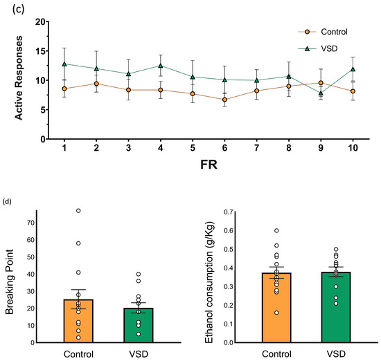 To analyze DID and acquisition of ethanol SA, a two-way ANOVA was performed with a between-subjects variable, VSD, with two levels (control and VSD) and a within-subjects variable, days, with four or ten levels for DID and FR1, respectively. The effects of VSD on breaking point values and ethanol consumption during PR were analyzed by a one-way ANOVA with a between-subjects variable, VSD.