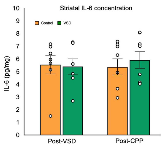 Regarding striatal IL-6 levels (Figure 9), the ANOVA did not reveal significant differences between control and VSD females, neither after the last VSD nor after CPP (F (3,26) = 0.154, p < 0.926).