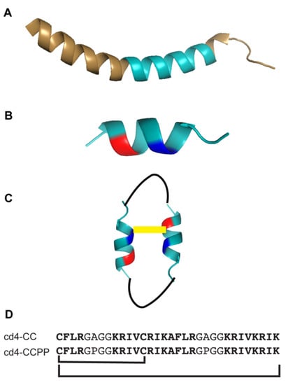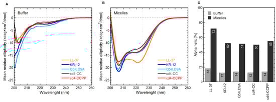 We have previously demonstrated that it is possible to increase the antimicrobial activity of the shortest antimicrobial region of LL-37, known as KR-12, by substituting specific amino acids [15]. In that work, Gln5 and Asp9 were identified as key positions to modulate antibacterial activity. The engineered peptide containing Lys and Ala substitutions at key positions (Q5K and D9A, respectively) displayed up to an 8-fold improvement in antimicrobial activity compared to KR-12. Further engineering of KR-12 and derivatives into head-to-tail cyclic dimers resulted in new peptide analogs with both increased antimicrobial and immunomodulatory activities, coupled with enhanced proteolytic stability [16,17]. When Pro residues were introduced in the linker region, the cyclic dimer CD4-PP exhibited a distinct α-helical profile (78% α-helical content), which was greater than that of parent peptide LL-37 (72% α-helical content) and the cyclic dimer from first-generation cd4 (65% α-helical content) [17].