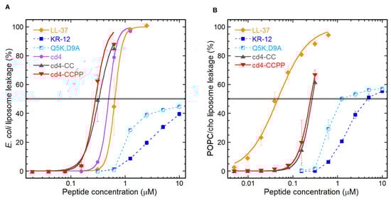 The liposome leakage indicated a membrane-disrupting activity for cross-linked cyclic dimers, similar to its parent peptide LL-37 and cyclic dimers peptides from our previous studies. Notably, cd4-CCPP outperformed LL-37 in terms of bacterial target selectivity by a factor of 6-fold. The cd4 dimer from the first-generation cyclic dimers [16], which was designed based on the native KR-12 sequence showed less membrane activity on E. coli liposomes as compared to cross-linked dimers (Figure 4A) More recently, we also have reported that LL-37 and CD4-PP caused the formation of blebs on the bacterial surface [17]. It has been reported that the interaction of Gram-negative bacteria with cationic AMPs not only involves components of the bacterial cell wall and lipopolysaccharide but also cell surface receptors [24,25,26]. Taken together, our data suggest that the formation of α-helical structures upon interaction with the bacterial membrane and subsequent membrane permeabilization are key steps for the mechanism of action of cross-linked dimers. However, we cannot rule out other possible targets within the cytoplasm, as previously reported for LL-37 [27].