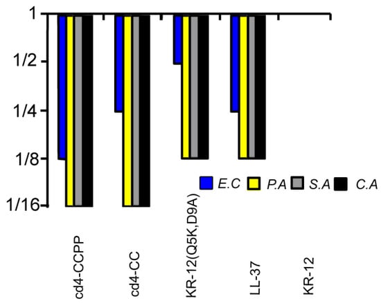 Relative MICs of the cross-linked cyclic dimers. The colors/patterns represent the organisms: E. coli (blue), P. aeruginosa (yellow) S. aureus (gray), and C. albicans (black). A four-residue linker was used to connect two KR-12 (Q5K,D9A) units. MIC values of LL-37 are E. coli: 0.625 µM; P. aeruginosa: 1.25 µM; S. aureus: 1.25 µM; C. albicans 2.5 µM. For cd4-CCPP values are 0.312, 0.625, 0.625, and 0.625 µM, respectively. All median MIC values can be found in Table 1.