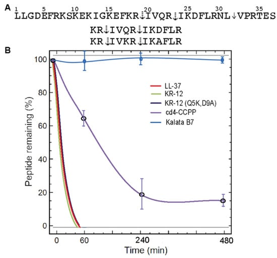 Proteolytic stability of cyclic peptides in relevant biological conditions and cleavage sites of parent peptides (LL-37, KR-12, KR-12 (Q5K,D9A)) by aureolysin. (A) Solid arrows indicate cleavage sites identified in this study, and dotted arrows represent cleavage sites reported earlier by aureolysin. (B) Stability profile of peptides in the presence of S. aureus protease, aureolysin.
