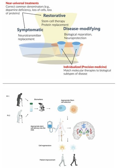 Upper panel: Stem cell therapies (SCT) may have both symptomatic and disease-modifying effects. The diagram also illustrates a major difference between symptomatic treatments, which are largely universal, versus disease-modifying treatments, which encompass both rescue and restorative treatments and precision medicine, which must be individualized, requiring biological subtyping. Lower panel: Stem cell therapies in the future should be based on biological markers of disease progression and administered through autologous transplantation, possibly directly injected into the brain target sites. This approach will hopefully allow cell regeneration and ultimately, a possible restorative disease-modifying effect improving patients’ symptoms. Created with BioRender.com.