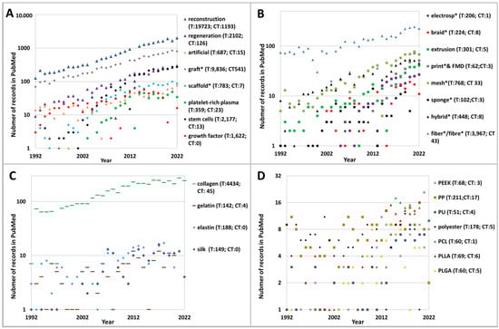The number of publications in the PubMed database concerned: (A) reconstruction, regeneration, artificial, graft, scaffold, stem cells, growth factors platelet-rich plasma; (B) electrosp*, extrusion*print*&FDM, fiber*/fibre*, braid*, mesh*, sponge*, hybrid*; (C) collagen, gelatin, silk, elastin; (D) polyester, PEEK, PET, PP, PU, PLGA, PLCL, PLA PCL.