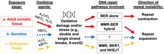 Environmental agents contribute to repeat instability. In adult somatic tissue (a), researchers have provided evidence for the role of an MMR-BER hybrid pathway in responding to potassium chromate or potassium bromate exposure, thus, leading to increased oxidative damage and susceptibility to repeat expansion. Additional studies support the role of components of BER and potentially MMR pathways in responding to oxidative damage, such as that induced by exogenous hydrogen peroxide or aging, again resulting in repeat expansion. Of note, when BER pathways alone are involved in responding to oxidative damage, evidence points to repeat contractions rather than expansions. Potassium bromate is shown to affect intergenerational repeat instability in germline cells via oxidative damage. The exact pathways that mediate this form of oxidative damage remain unknown; however, evidence suggests that oxidative damage in the germline (b) promotes repeat expansion. Differences in female and male germline instability call for future studies to investigate mechanistic differences in environmentally induced repeat instability in egg and sperm. Both hydrogen peroxide and potassium bromate exposure to embryonic tissue (c) is shown to promote repeat expansion. Studies have pointed to the role of MSH2 (component of MMR pathway), as well as suggest additional, potentially hybrid pathways, involving BER and NHEJ in mediating the response to oxidative damage and facilitating repeat expansion. Further research also showed that pluripotent cells are especially susceptible to repeat instability in response to environmental exposures.